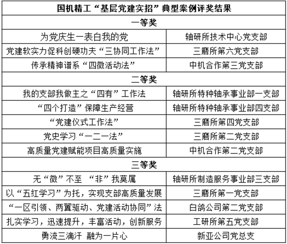經國機精工黨委遴選評比,公司技術中心黨支部《為黨慶生——表白我的黨》榮獲評比一等獎;特種軸承事業部一支部《我的支部我做主之“四有”工作法》、特種軸承事業部四支部《“四個打造”保障生產經營》榮獲評比二等獎;制造服務事業部三支部《無“微”不至“非”我莫屬》榮獲評比三等獎;公司黨委榮獲優秀組織獎。